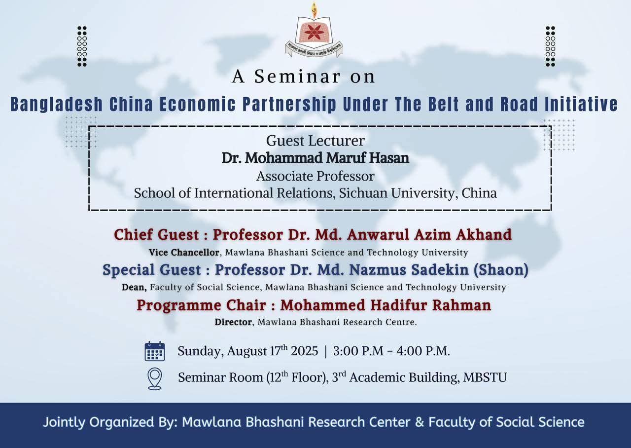 মাওলানা ভাসানী বিজ্ঞান ও প্রযুক্তি বিশ্ববিদ্যালয়ে (মাভাবিপ্রবি) ‘Bangladesh–China Economic Partnership under the Belt and Road Initiative’ শীর্ষক এক সেমিনার ১৭ আগস্ট ২০২৫, বিকেলে বিশ্ববিদ্যালয়ের একাডেমিক ভবনের ১২ তলায় অনুষ্ঠিত হয় ।